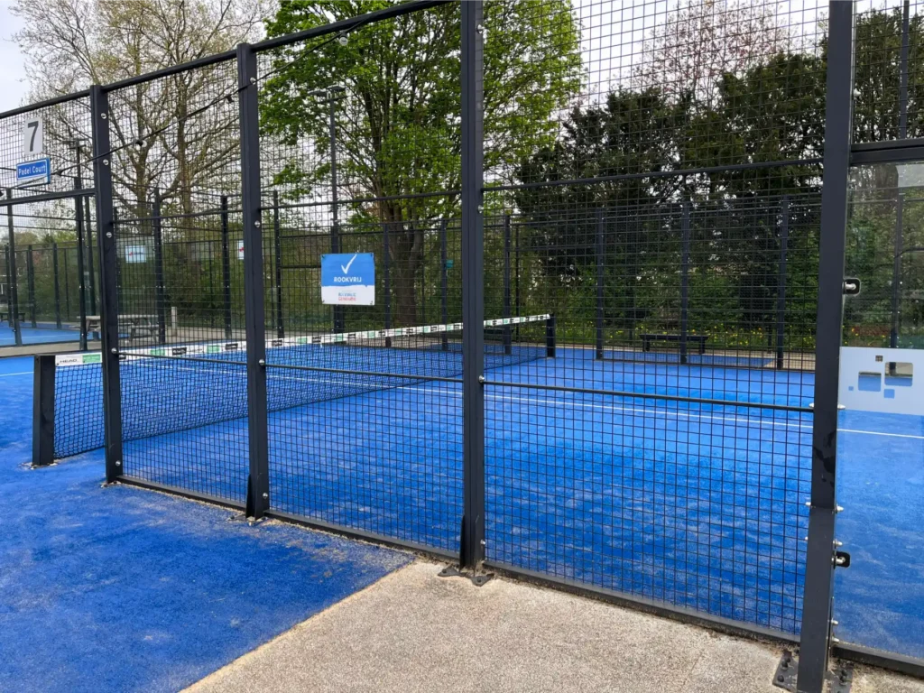 De padelbaan is een rechthoekig veld omsloten door muren en hekwerk, die een integraal deel van het spel vormen.